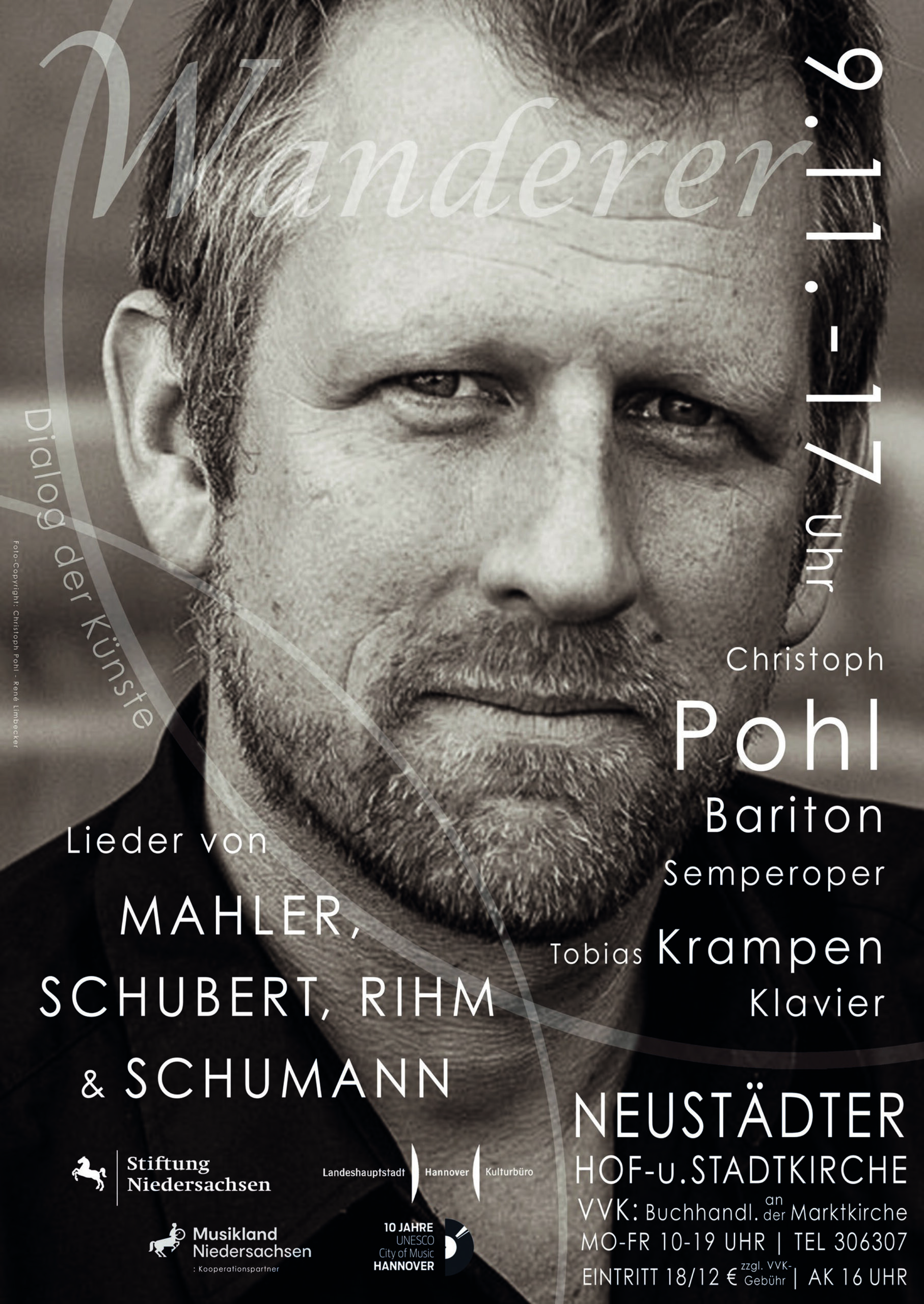 Am 9. November 2025 um 17 Uhr freuen wir uns sehr auf einen weiteren großen Liederabend mit Bariton Christoph POHL (Semperoper Dresden), dem wir ganz herzlich zur Ernennung zum Kammersänger gratulieren, und Tobias KRAMPEN am Klavier. Unter dem Titel „WANDERER“ erklingen die „Lieder eines fahrenden Gesellen“ Gustav MAHLERs sowie die „Lieder nach Gedichten von Justinus Kerner“ (op. 35) von Robert SCHUMANN. Daneben werden die „Nietzsche-Lieder“ Wolfgang RIHMs dialogisch mit thematisch ausgewählten Liedern von Franz SCHUBERT verflochten. Einer jungen Tradition folgend sind wir dafür erneut in der Neustädter Hof- & Stadtkirche zu Gast (Rote Reihe 8, 30169 Hannover).
