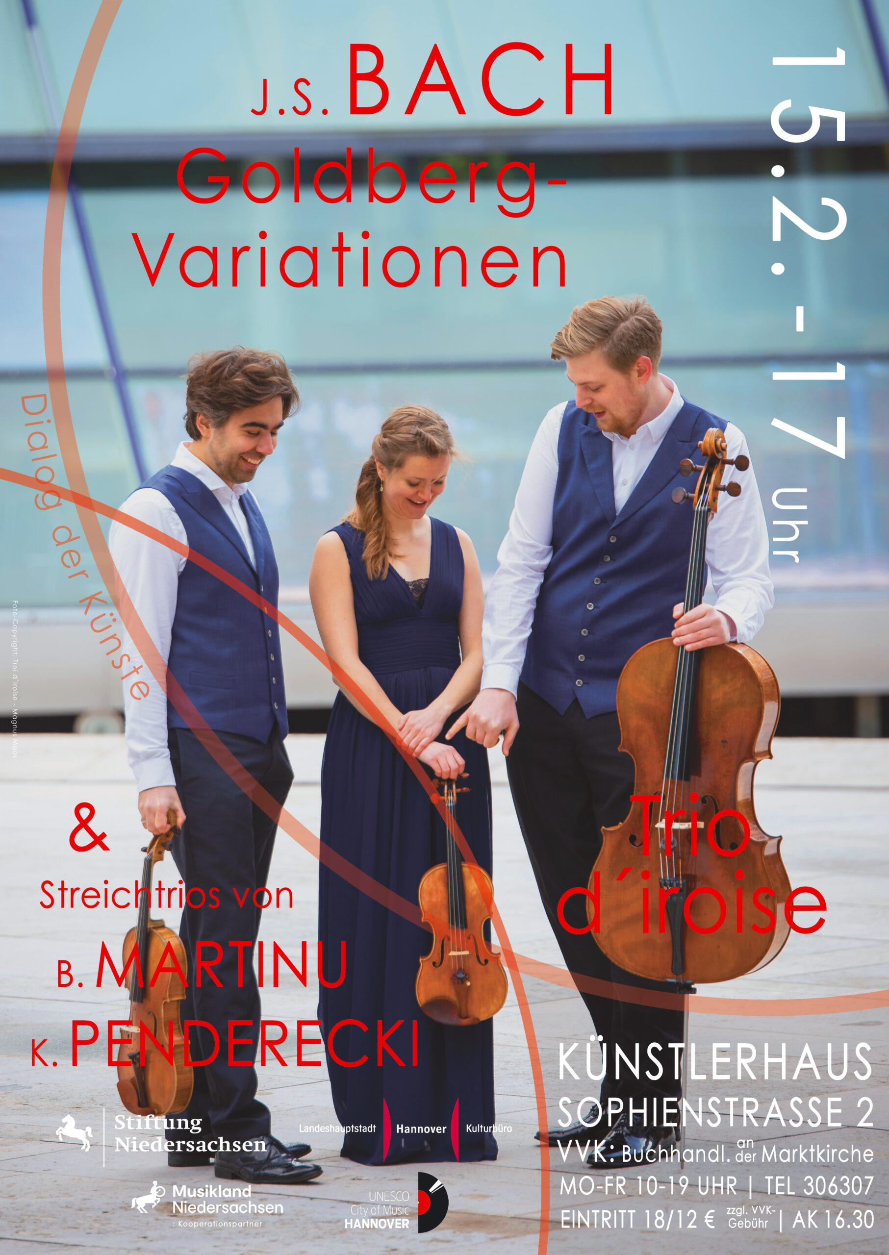 Am 15. Februar 2026 um 17 Uhr gestaltet das bezaubernde TRIO D´IROISE in unserer ´rastlos´-Saison 2025/26 einen großes Kammerkonzert unter dem Titel „Schöpferische Unruhe“ mit J. S. BACHs weltberühmten „Goldberg-Variationen“ im Zentrum in der besonderen Bearbeitung für Streichtrio. Daneben erklingen das zweite Streichtrio von Bohuslav MARTINU sowie Krysztof PENDERECKIs Streichrio. Das Konzert findet im Joseph-Joachim-Saal des Künstlerhauses statt (Sophienstraße 2, 30159 H. im 2. OG).